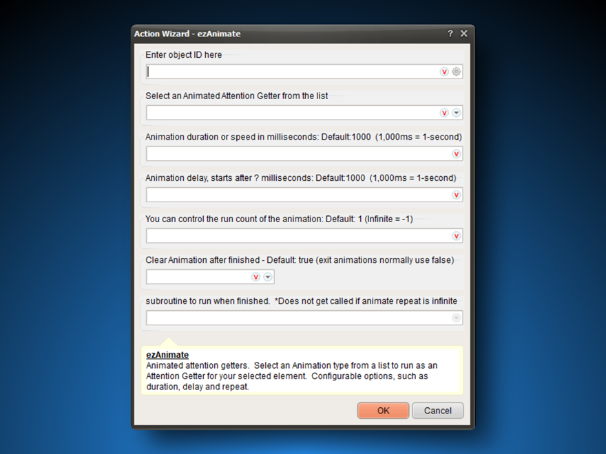 Easily add cross-browser animations for use in your web projects and even assign a subroutine when finished. Great for emphasis, bring attention to links, buttons, images, anywhere you want attention-guiding hints.