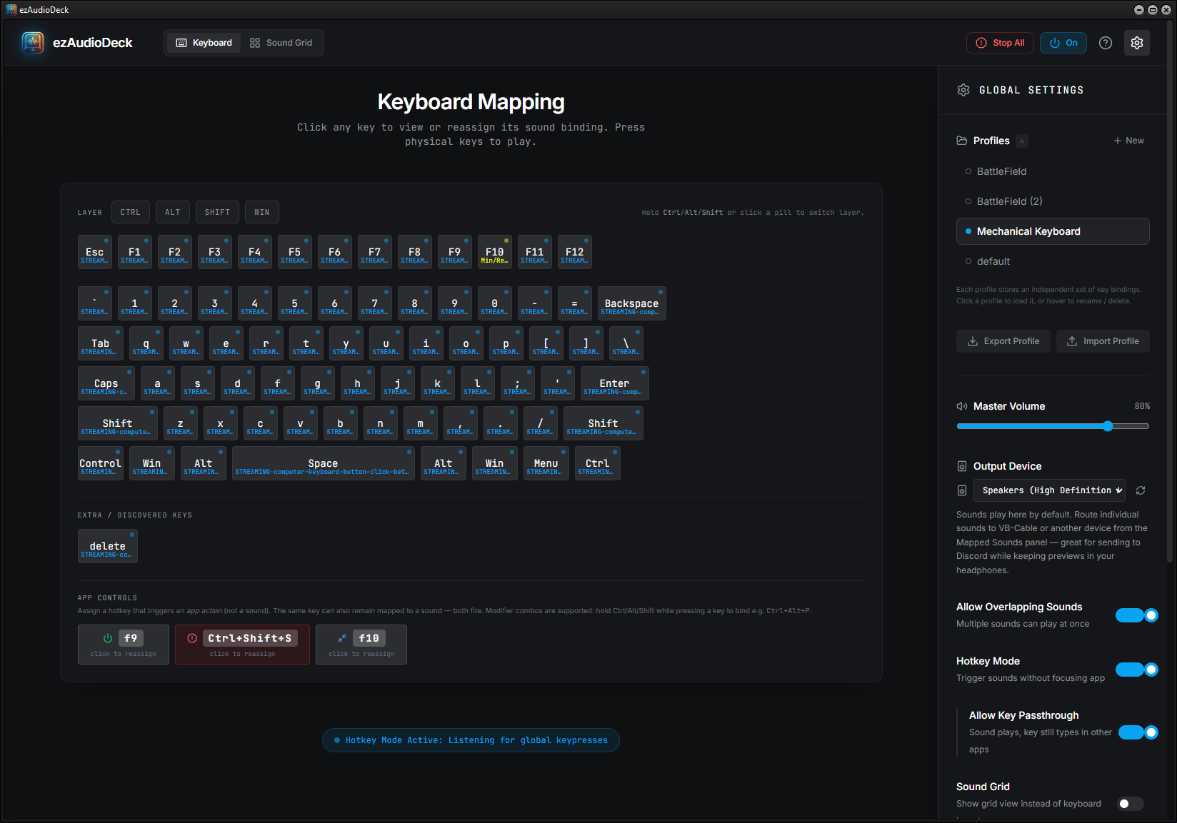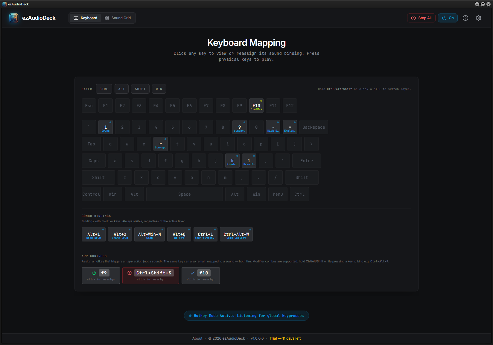 Map keyboard keys to sounds, stream effects, and more — works even when minimized.