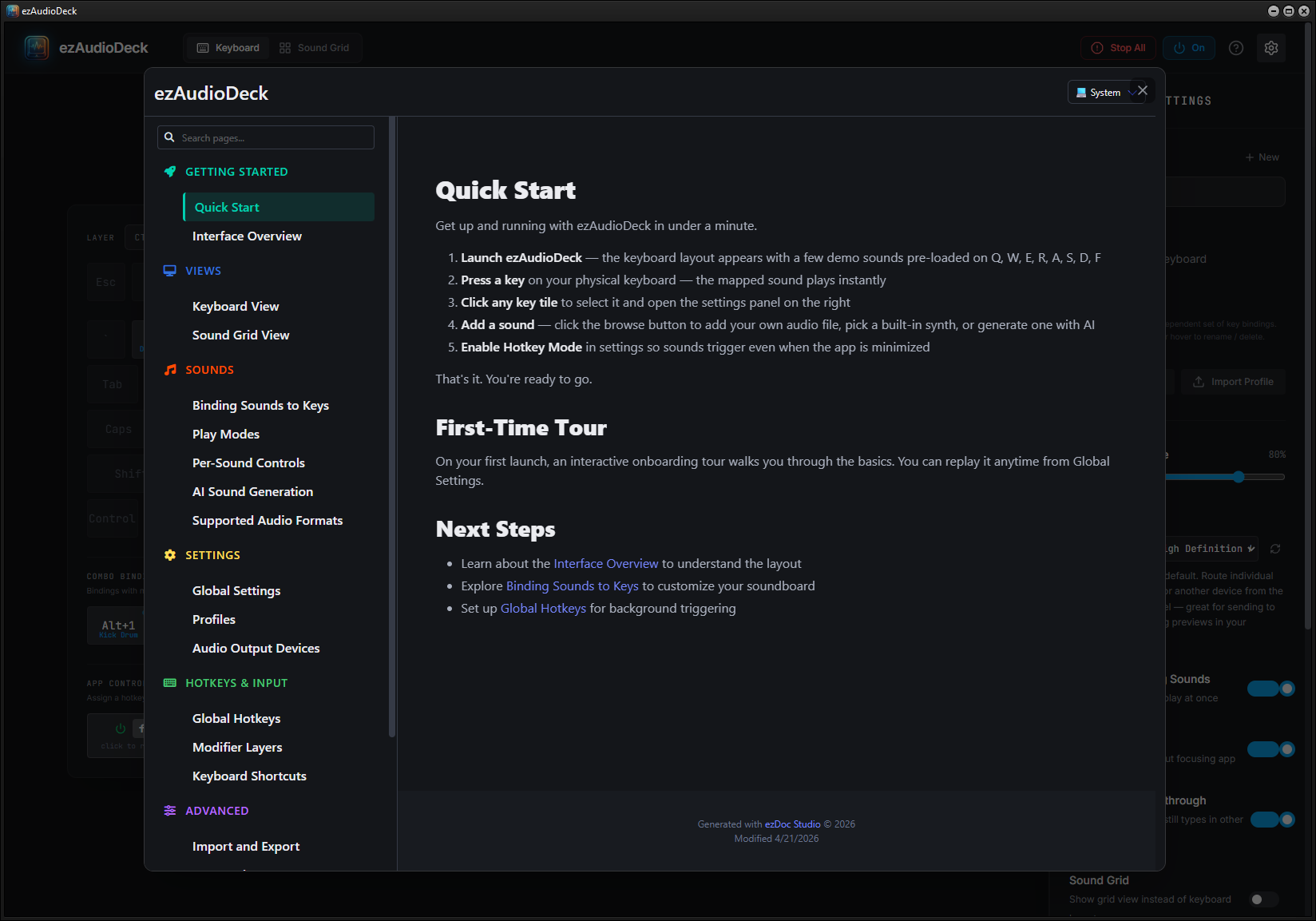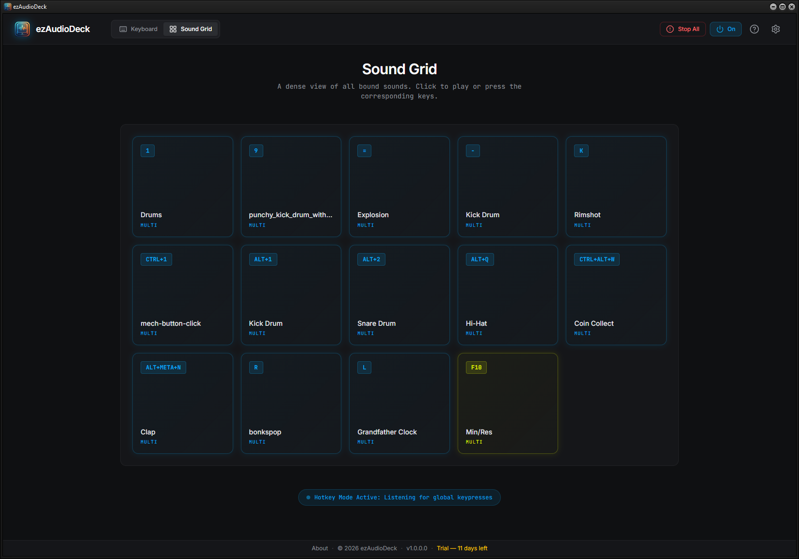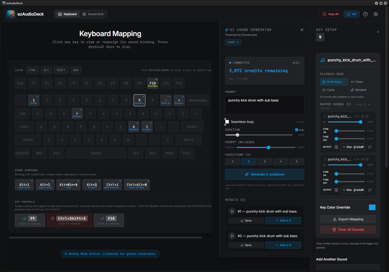 ezAudioDeck is a Windows audio trigger pad that turns your keyboard into a professional sound effects board. Bind any key to any sound — single keys, key combinations, or even your Stream Deck. Generate custom sound effects on-the-fly using AI from Eleven Labs. Import/export complete sound packs and share with friends. Perfect for streamers, podcasters, content creators, and musicians who need instant, reliable audio control.