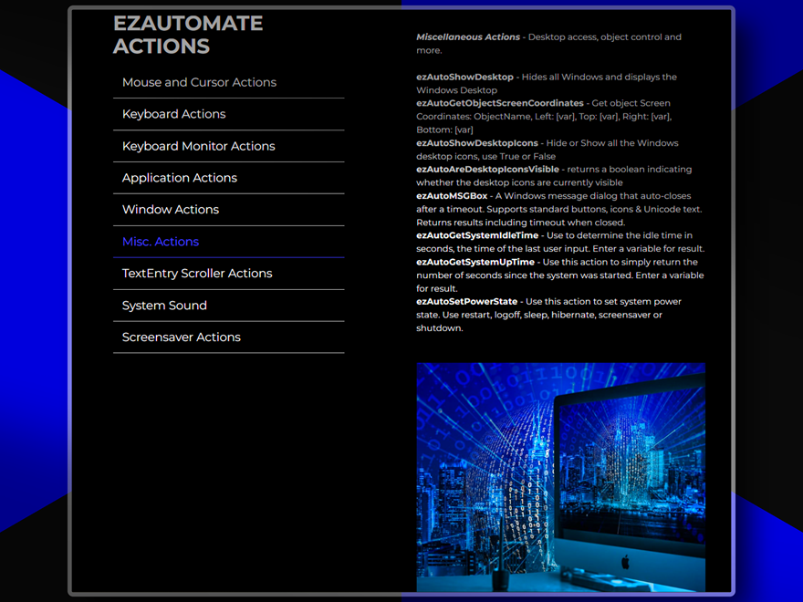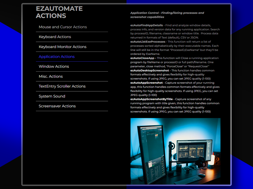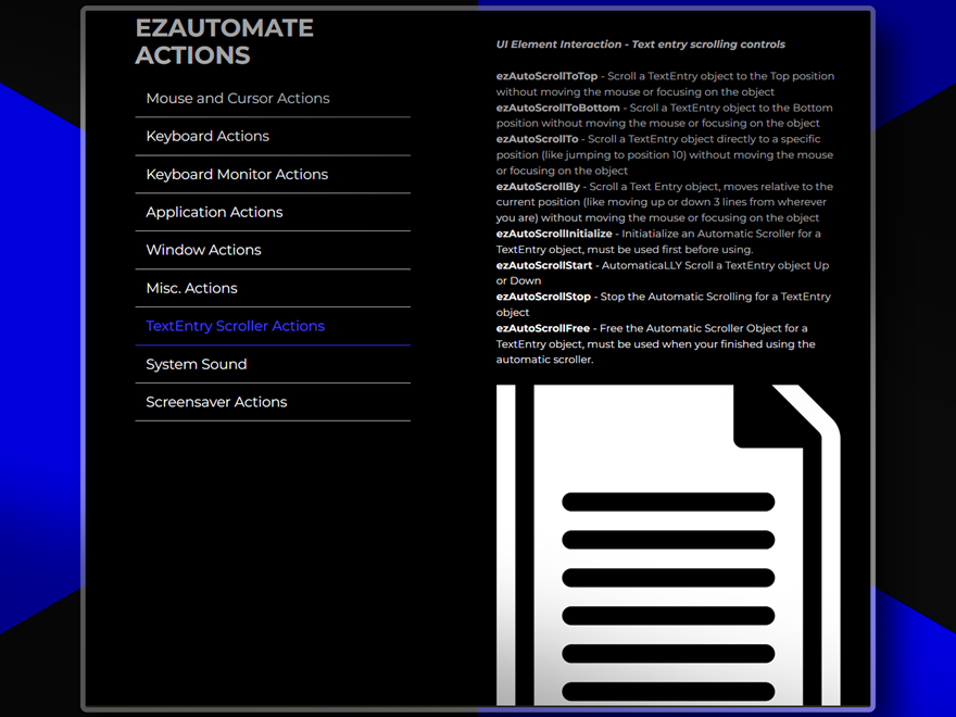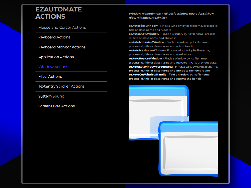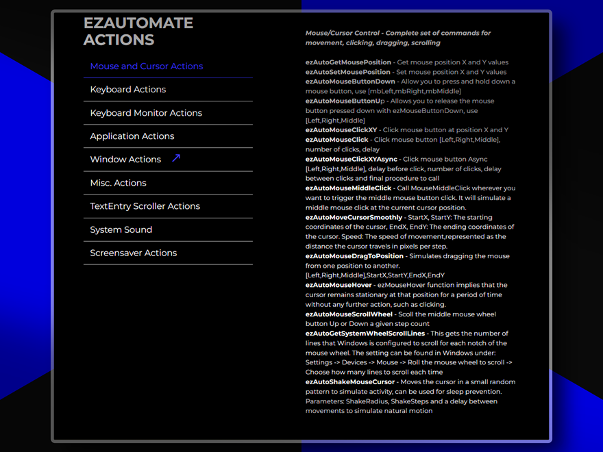 A comprehensive Windows automation toolkit that provides precise control over mouse movements, keyboard inputs, window management, and system operations. Features include smooth cursor movements, global hotkeys, keyboard monitoring, application screenshots, desktop control, system sound management and more. Perfect for creating sophisticated automation apps or adding powerful features with minimal coding complexity to any project. This is arguably the most powerful plugin ever developed for VisualNeo for Windows!