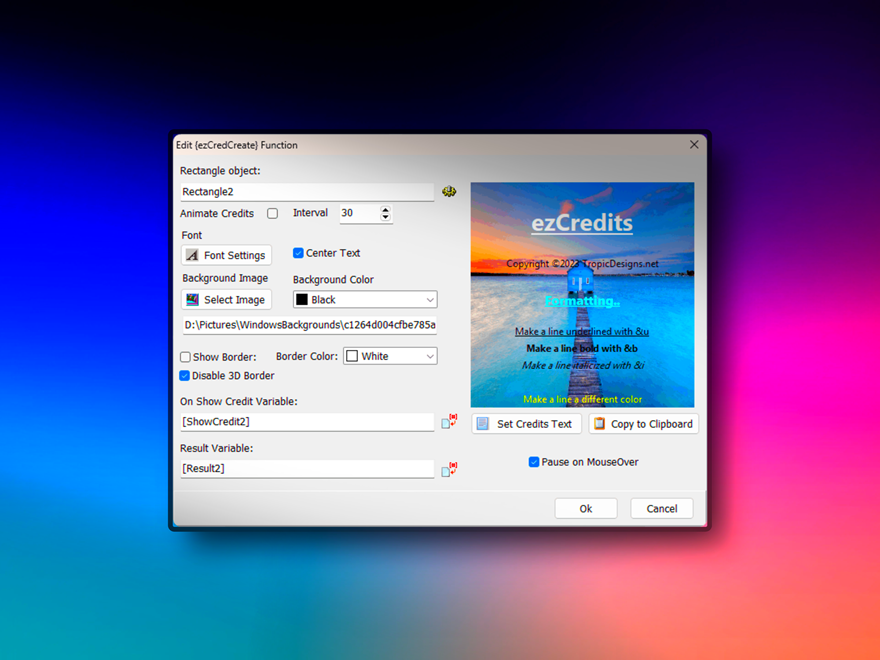 Configurable subroutines for click events and on last credit displayed. Configurable variable that contains the current line added to credits, this is handy for display or configurable actions based on your key word. Sample apps provided upon purchase..