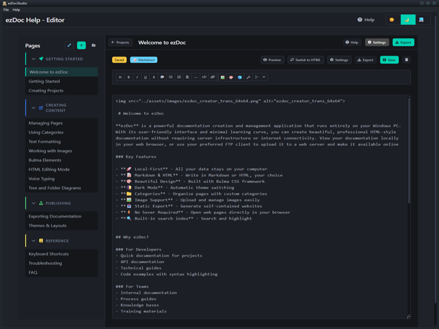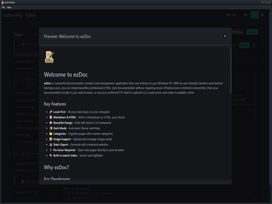ezDoc is a local-first documentation creation tool that runs entirely in