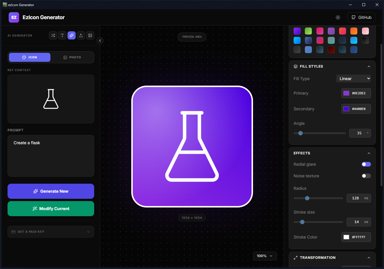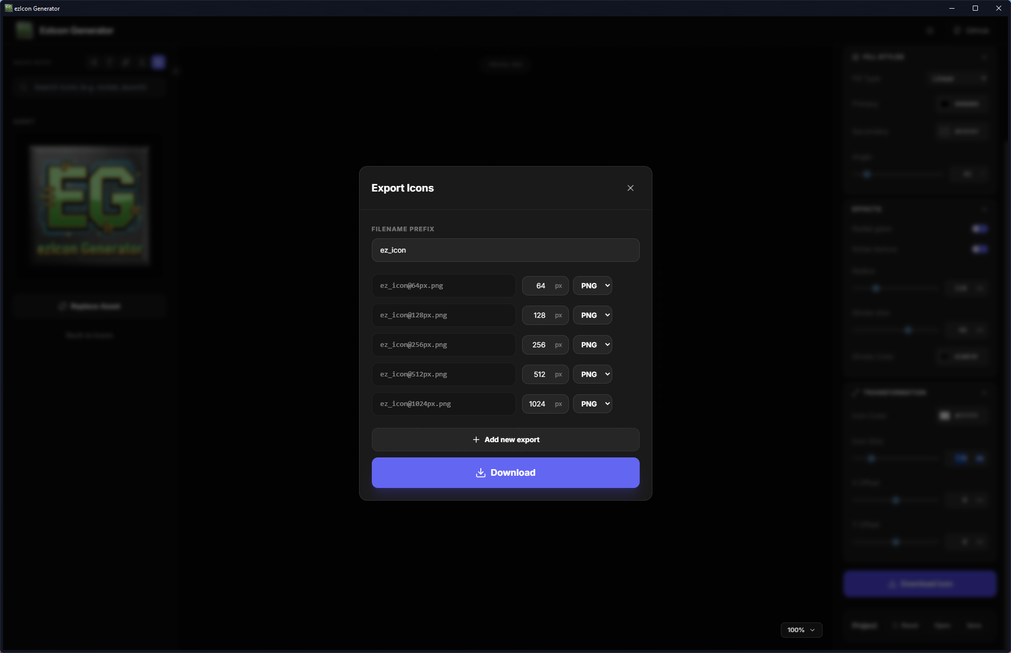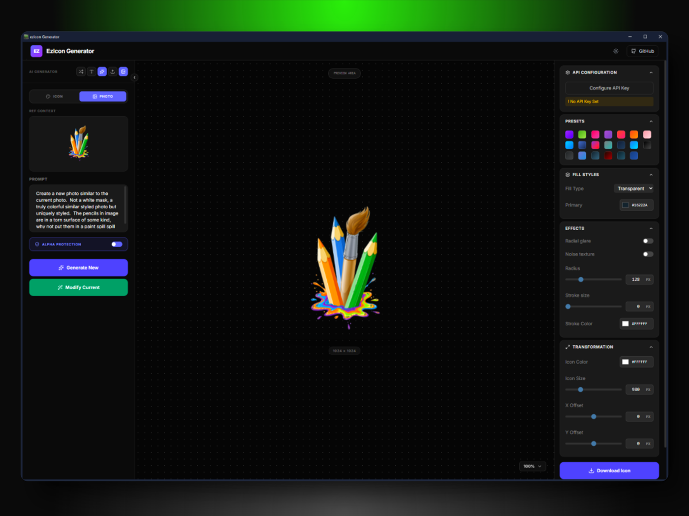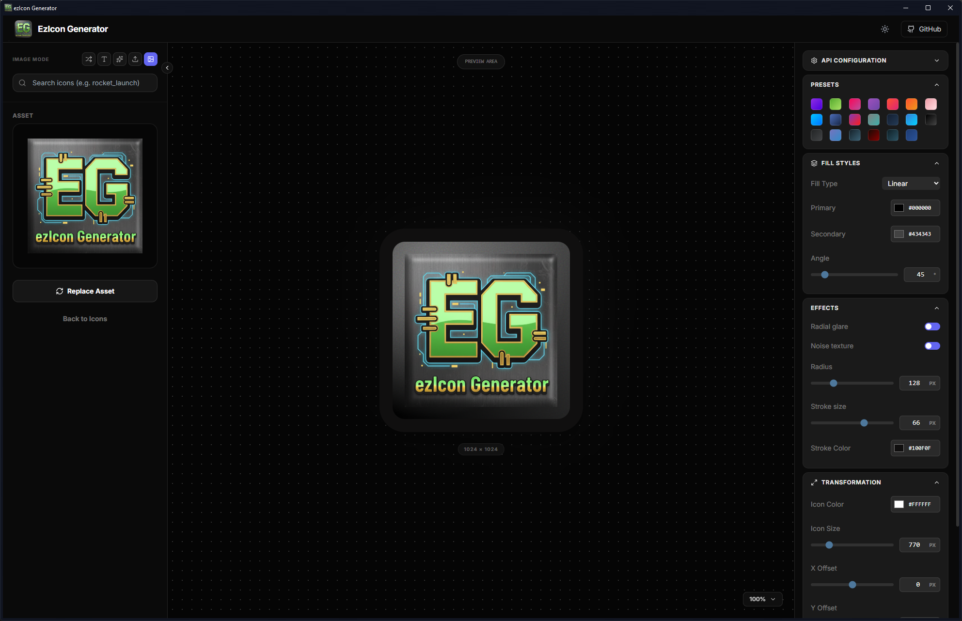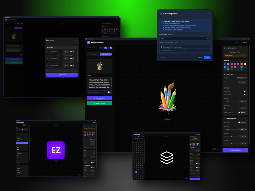 EZIcon Generator is a high-performance tool for creating custom text and image icons with live preview and bulk export. Choose from vast libraries like Material Symbols and Font Awesome, or use your own images and text. With a Google Gemini API Key, you can change icons and also generate unique icons using AI-driven prompts with the power of Nano Banana.