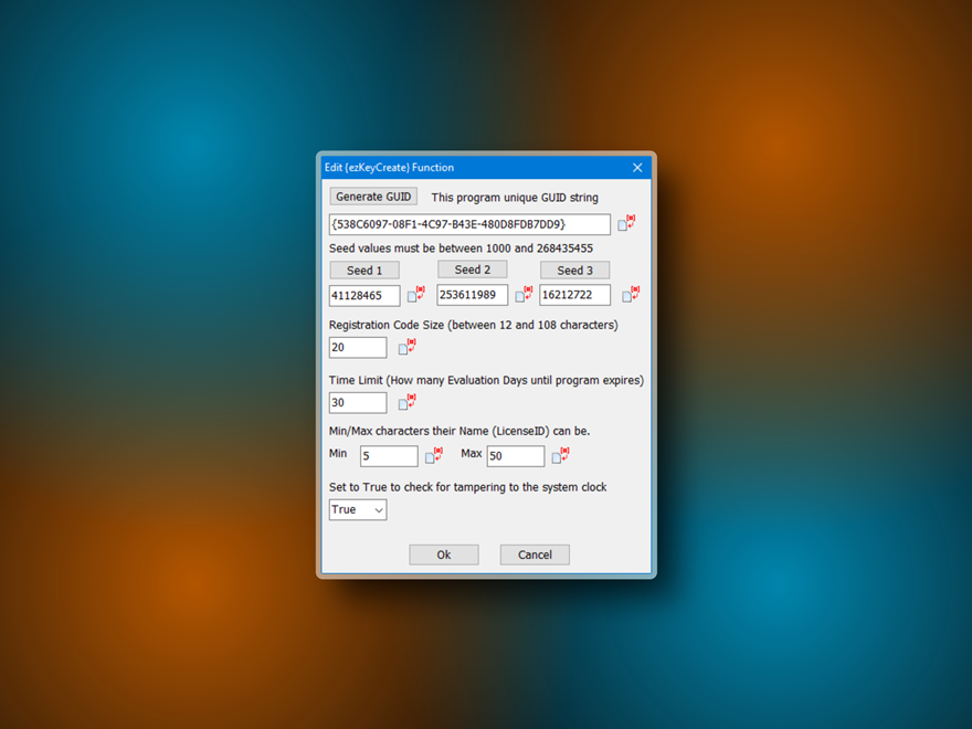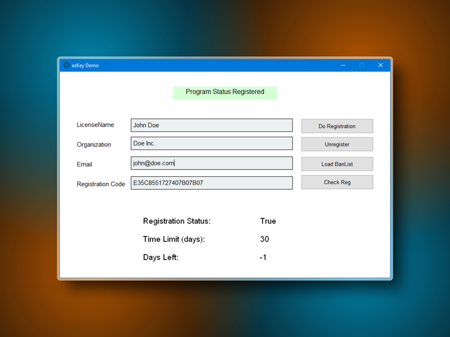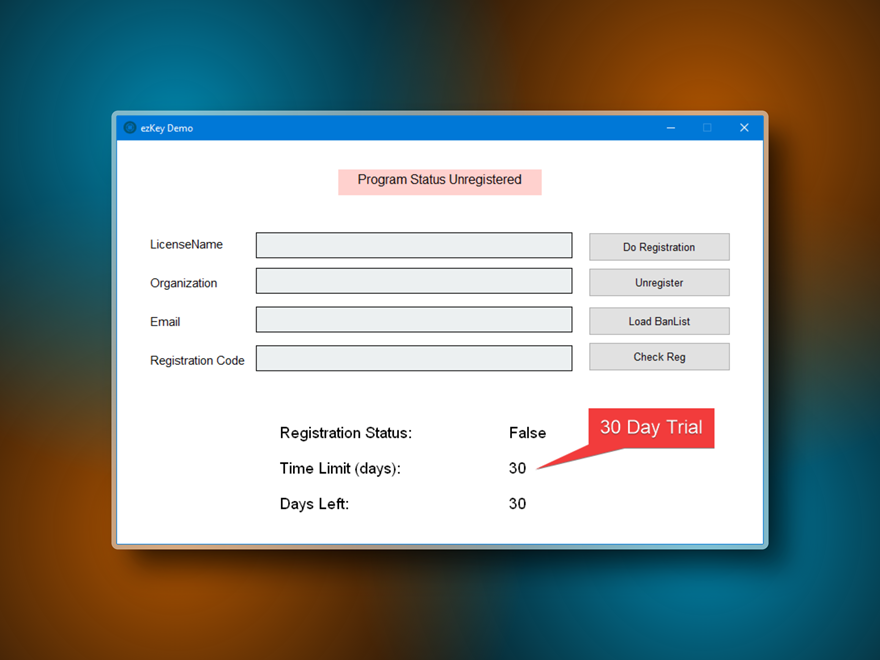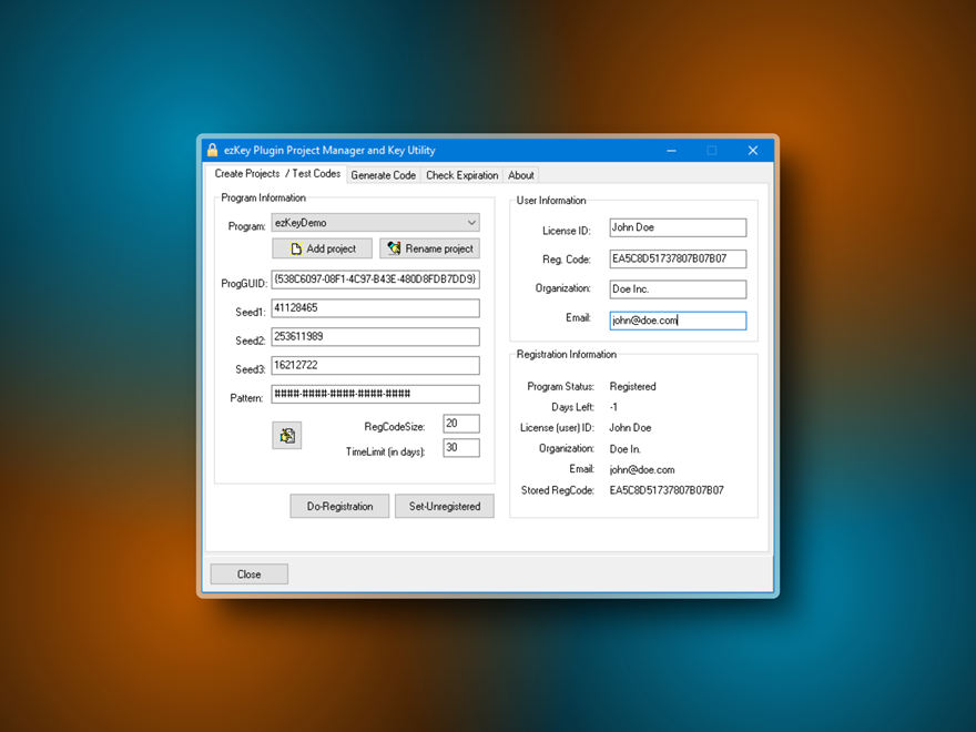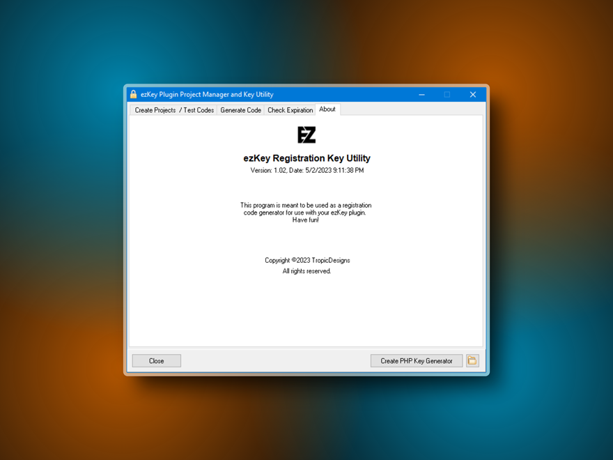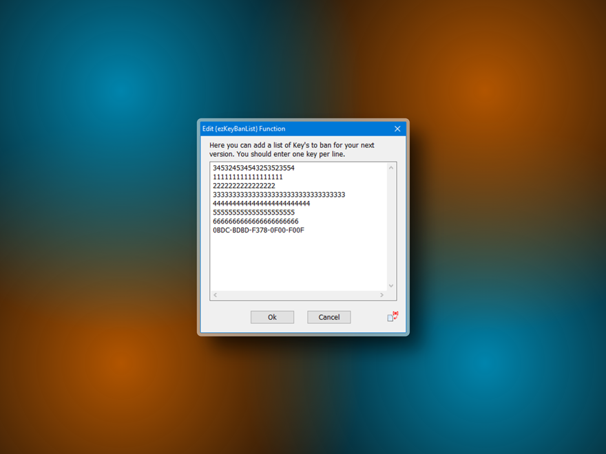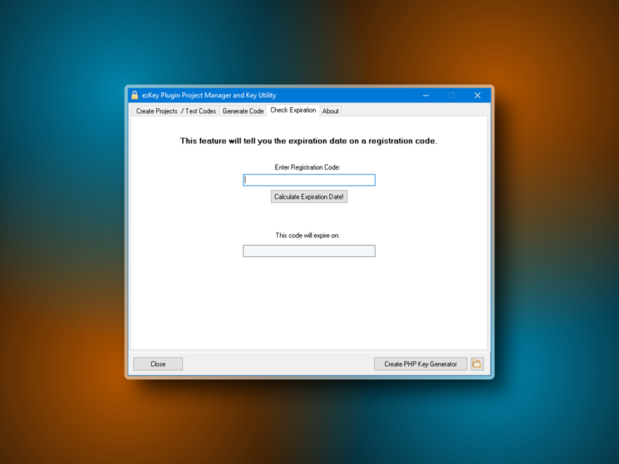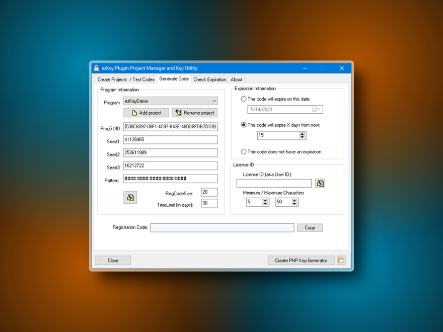 Created keys optionally allow an expiration date to be hidden in the registration code. This would help prevent the illegal spread of issued codes over a period of time. So, If a user enters a registration code beyond the expiration date, ezKey will not accept the code. With each software version you can create a ban list of keys to deny. You can even generate PHP files for each project. This will make it possible for you to create registration codes on your web server. Perfect for online purchases.