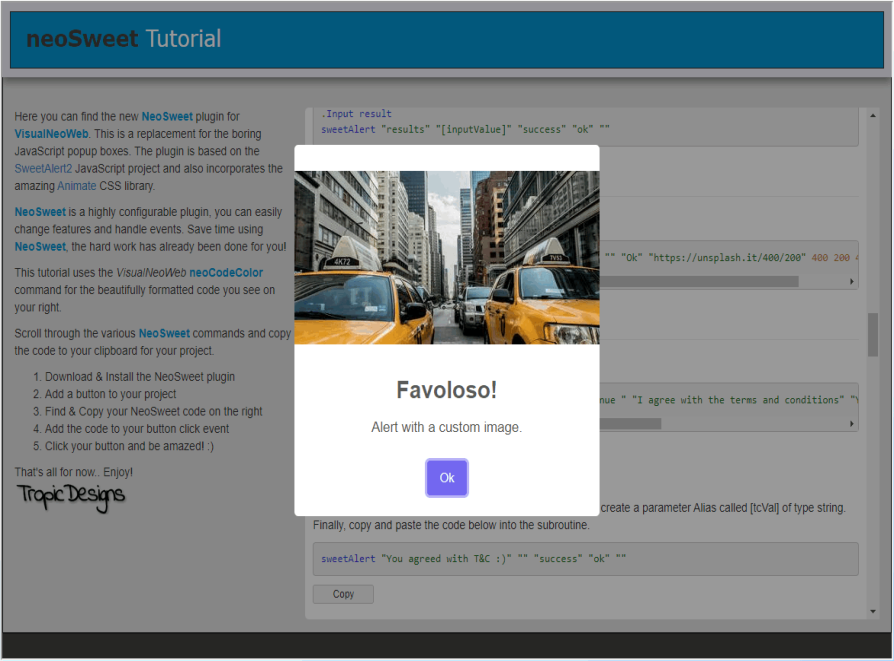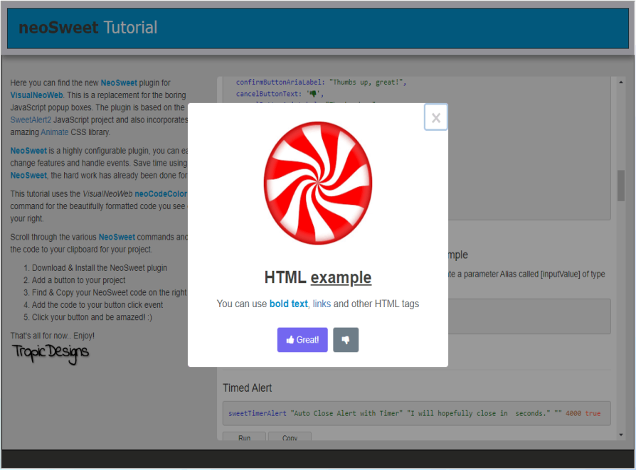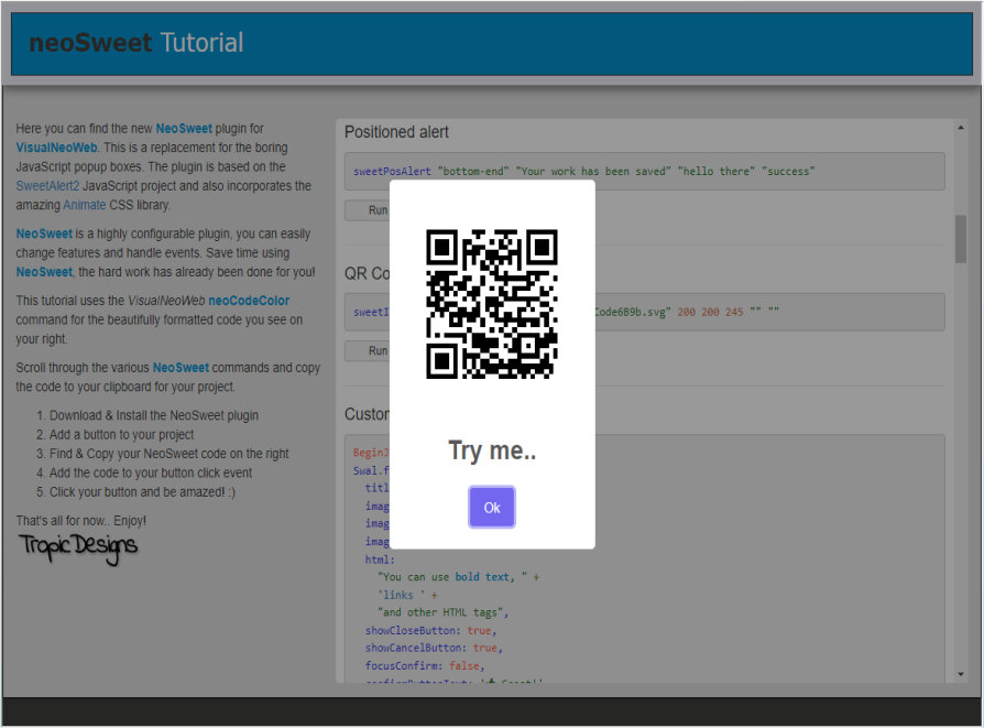 This stunning animated alternative to the basic JavaScript popup enhances your VisualNeo Web App's aesthetic appeal. With an array of customizable options, it is fully responsive and adaptable to your needs. In addition, we have provided multiple examples along with project source code for you to explore in the demo below.