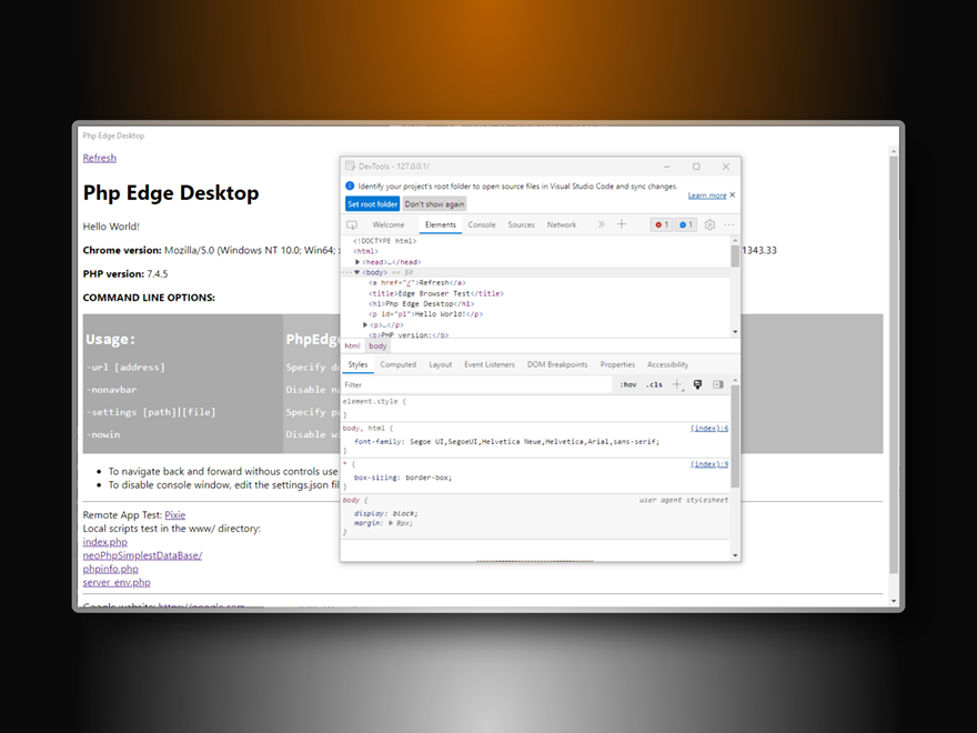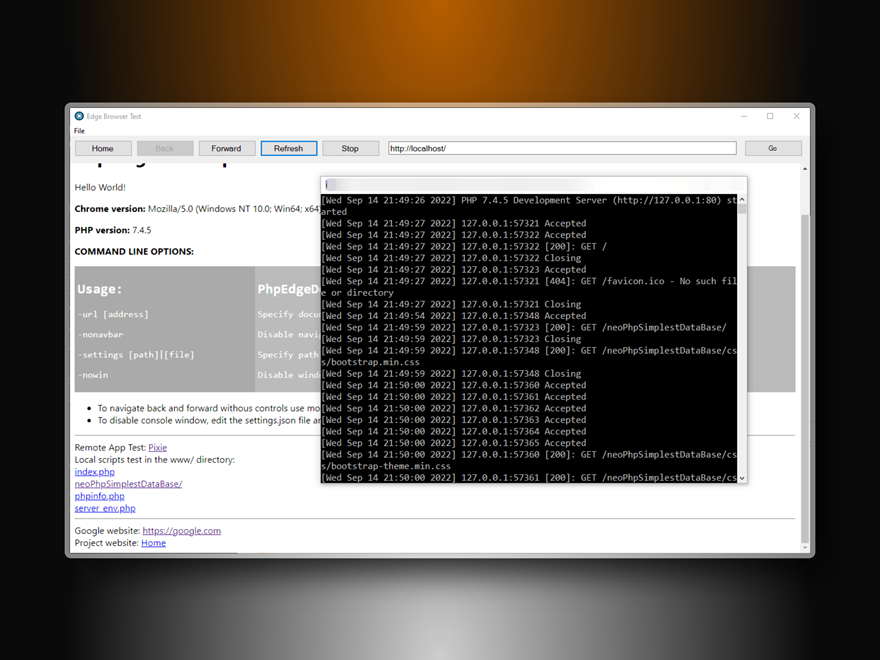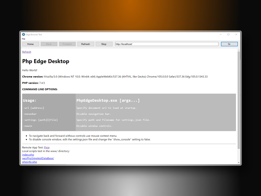 The phpEdgeDesktop project provides a simple way of running web based projects like Php, HTML5 and JavaScript as a Windows desktop software. This is an easy to use, simple solution we can use to create desktop applications with the Microsoft Web Edge Webview2 technology, PHP, etc.. Samples included, no installation is required just unpack and run anywhere, see help file for customizations needs