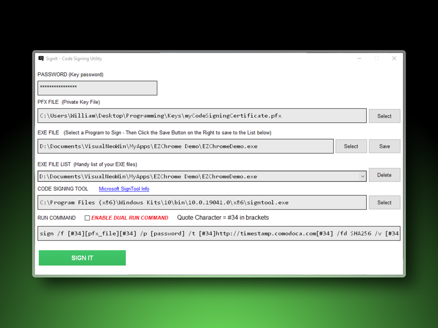 SignIt is a simple to use Windows software to digitally sign your EXE files. SignIt requires a Digital Code Signing Certificate private keyfile. Before using this software, you must purchase a Code Signing Certificate from companies like Sectigo, Thawte, etc. After installing the certificate and installing Signtool, part of the Windows SDK, you're ready to use SignIt.