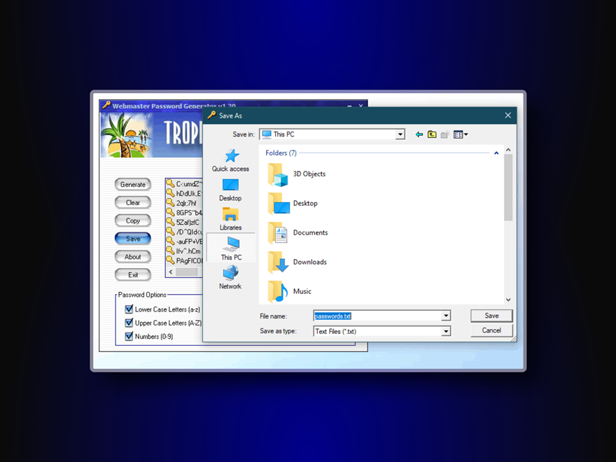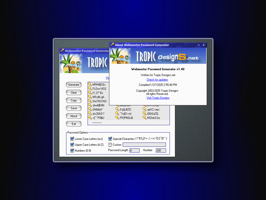 click. You can specify the password length, the use of numbers, special characters, custom characters, upper/lower case and more. The generated password list can be saved to a text file or copied to the Windows clipboard for ease of use.